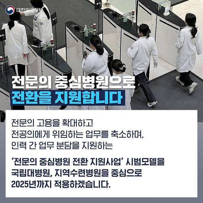 전문의 고용을 확대하고 전공의에게 위임하는 업무를 축소하며, 인력 간 업무 분담을 지원하는 ‘전문의 중심병원 전환 지원사업’ 시범모델을 국립대병원, 지역수련병원을 중심으로 2025년까지 적용하겠습니다.