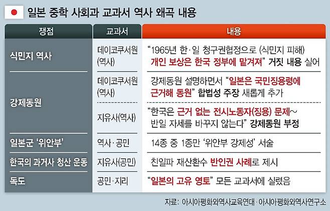한국의 과거사 청산 운동을 ‘반인권적’이라며 폄훼하는 내용도 새롭게 실렸다. 지유샤의 공민 교과서엔 “한국에선 2005년 일본 통치 시기 일본에 협력한 사람들의 재산을 국가로 귀속시키는 일이 법률로 정해졌다. 이런 인권문제에 대해서는 (일본이 한국에) 확실한 개선을 요구하는 것이 진정한 의미의 우호임을 잊어서는 안 된다”고 서술됐다.