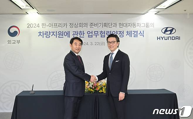 (서울=뉴스1) = 김일범 현대자동차그룹 부사장(오른쪽)과 정기홍 한-아프리카 정상회의 준비기획단장이 22일 서울 종로구 코리안리 빌딩에서 2024 한-아프리카 정상회의 공식 의전 차량 지원 협약을 체결하고 있다.