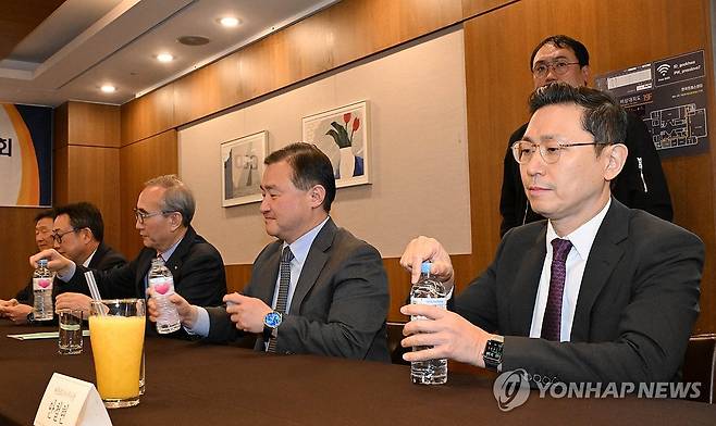 (서울=연합뉴스) 22일 서울 중구 프레스센터에서열린 방송통신위원장-통신사·단말기 제조사 CEO 간담회에서 기업 관계자들이 김홍일 방송통신위원장을 기다리고 있다. 오른쪽부터 안철현 애플코리아 부사장, 노태문 삼성전자 사장, 김영섭 KT 대표, 유영상 SK텔레콤 대표, 황현식 LGU+ 대표. 2024.3.22 [사진공동취재단]