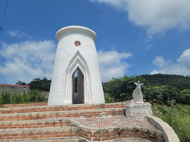 압해도 송공항에서 배를 타고 대기점도 선착장에서 내리면 처음 만나는 예배당이 1번 건강의 집(베드로). 건물 외벽은 하얗고 지붕은 코발트 블루여서 지중해 연안의 산토리니 풍 건물을 옮겨온 듯하다. 베드로는 닭이 울기 전에 예수를 세 번 부인했으나 해가 동쪽에서 뜨는 것을 보면서 뉘우친 수제자. 네로 황제 때 체포돼 십자가에 거꾸로 못 박혀 순교했다. 가톨릭의 초대 교황이다.