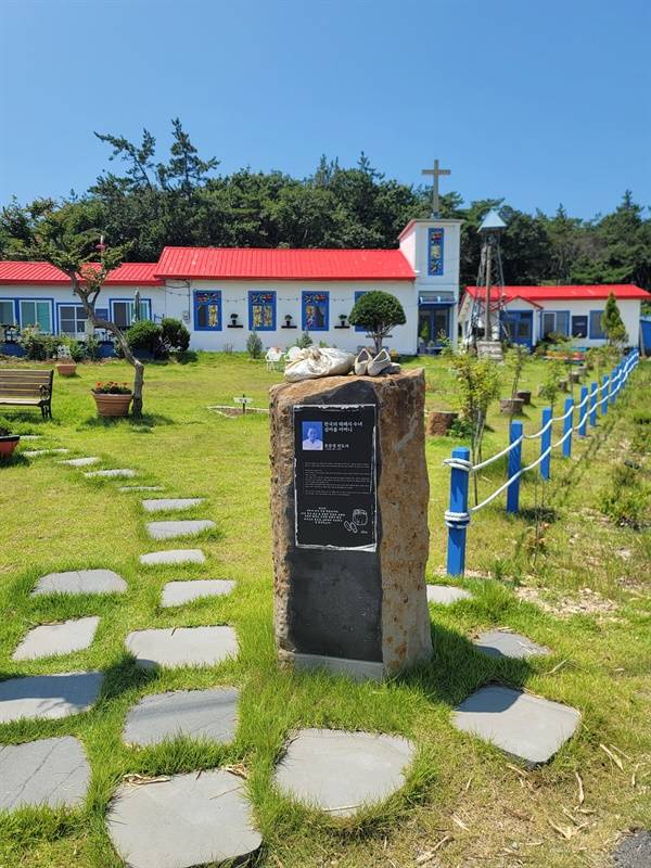 | ▲ 번외 소악교회. 문준경 전도사를 알리는 표석 위에 문 전도사의 고무신과 보따리가 올려져 있다. |
