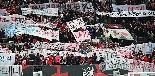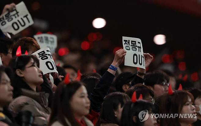 이날 팬들은 '정몽규 OUT'이라고 적힌 손팻말을 단체로 꺼내 들었고, 붉은악마 일부 관계자는 '몽규 아웃'이라고 적힌 대형 깃발을 흔들기도 했다.