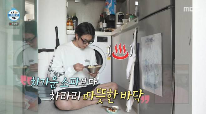 이어 주방에서 아침을 준비한 뒤 그대로 바닥에 앉아 아침 식사를 하는 박서함. 그는 "쇼파 아닌 쇼파가 있다. 사고 보니까 야외용 플라스틱 쇼파더라. 사용을 해봤는데 겨울에 굉장히 차갑다"며 "보일러가 들어오면 바닥이 따끈하지 않냐. 한번 앉았는데 너무 따뜻해서 바닥에서 먹기 시작했다"고 말했다.