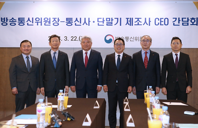 김홍일 방송통신위원회 위원장은 어제(22일) 서울 중구 프레스센터에서 유영상 SKT 대표, 김영섭 KT 대표, 황현식 LG유플러스 대표, 노태문 삼성전자 사장, 안철현 애플코리아 부사장을 만나 번호이동 전환지원금 인상에 협조해줄 것을 요청했습니다.