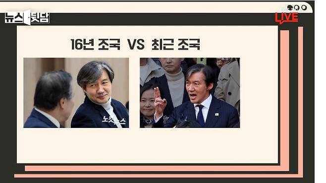 ▶윤지나> 제가 너무 인상적인 사진이 있어서 제가 한번 갖고 왔는데 과거의 조국 대표의 모습과 원화하고 있어 최근 조국의 모습입니다. 16년도 사진도 시국토론회, 엄한 자리였거든요. 온화하죠. 그런데 요즘에는…