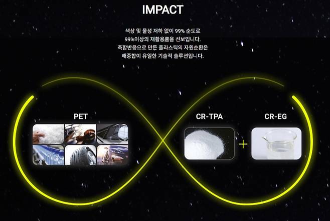 국내 최초로 상업화 규모의 고순도 재생 TPA(CR-TPA) 생산에 성공했으며, 현대차 AVP본부 기초소재연구센터와 함께 차량 폐부품의 화학적 재활용 실증연구를 통해 기술 역량을 입증했다.
