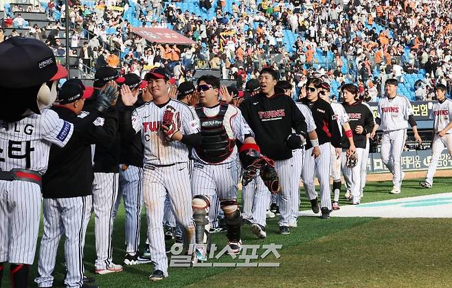 8대 2로 승리한 LG선수들이 경기 후 자축하고 있다.