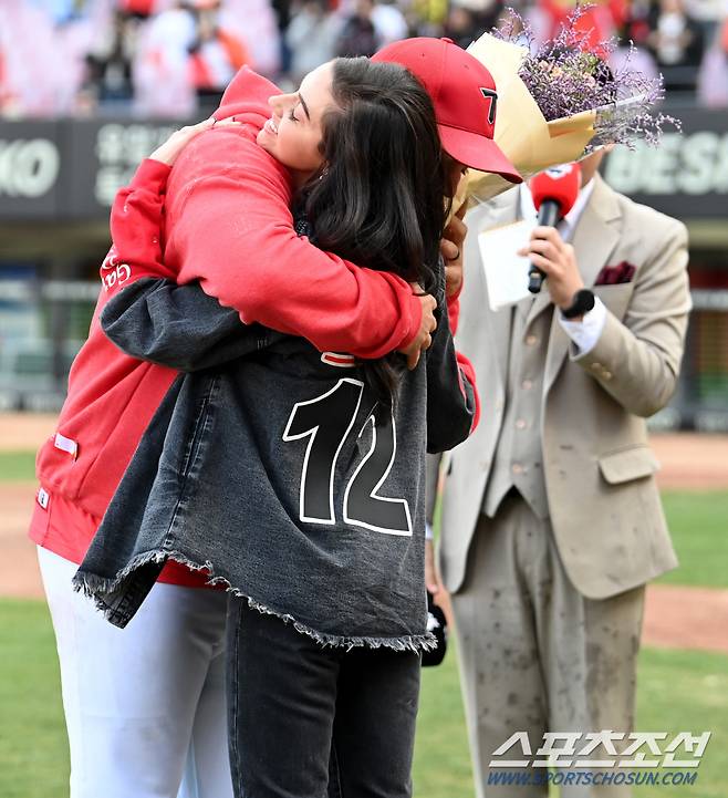 아내의 축하에 이어 동료들의 축하세례도 이어졌다. 양현종이 먼저 나와 크로우를 안아주자 뒤이어 나온 타이거즈 동료들이 시원한 물세례를 선사하며 KBO리그 데뷔 첫 승의 기쁨을 함께 만끽했다.