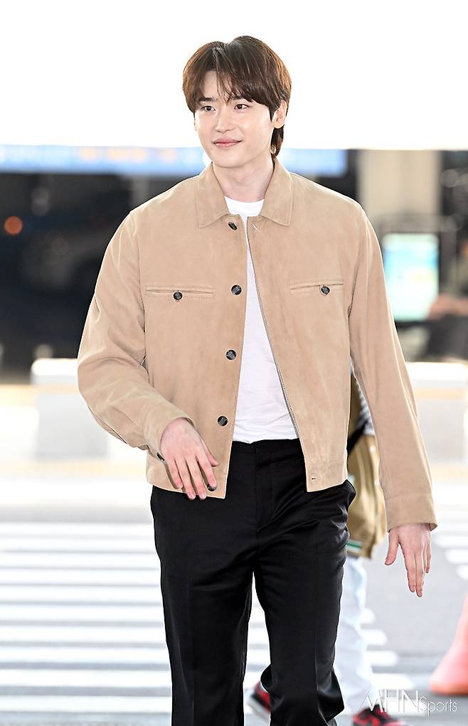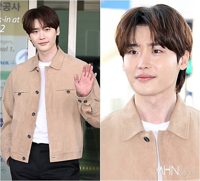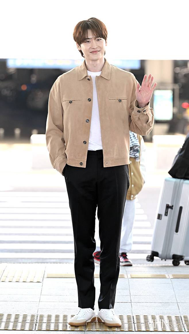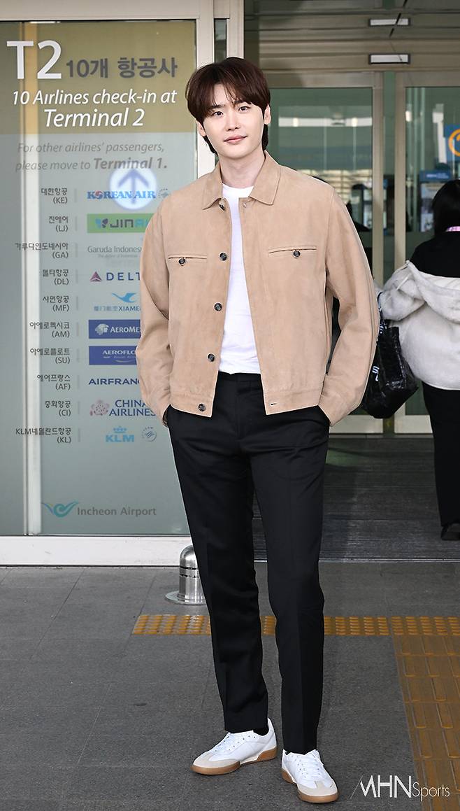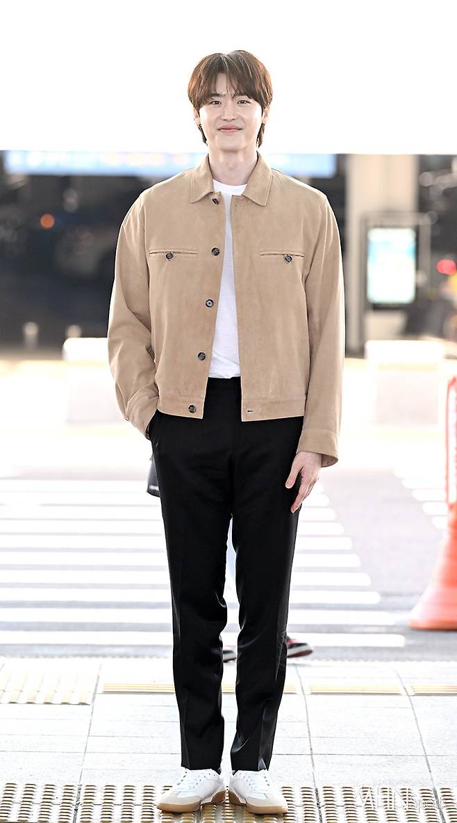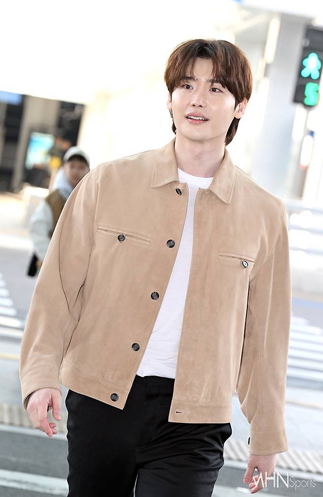 이날 이종석은 스니커즈에 블랙 팬츠와 화이트 티셔츠, 베이지 스웨이드 재킷을 매치하며 심플하면서도 댄디한 공항패션을 선보였다.