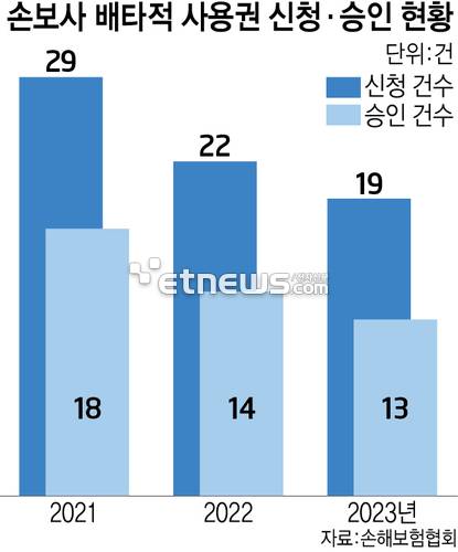 지난해 손보사의 배타적 사용권 신청과 승인 건수는 각각 19건, 13건으로 지난 2021년(29건, 18건)과 2022년(22건, 14건)에 이어 하락세다. 생보사 배타적사용권 부여 상품도 지난해 7건으로 2021년(9건)과 2022년(9건) 대비 축소됐다.