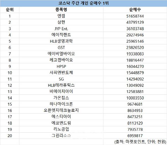 코스닥 주간 개인 순매수 1위 '엔켐'