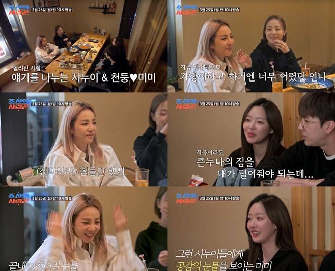 19살 나이에 ‘가장’으로서 활동해야 했던 산다라박의 이야기에 천둥♥미미도 같이 숙연해졌다. 미미는 산다라박을 향해 “오빠한테도 많이 들었어요. 그때마다 오빠가 큰누나 짐을 내가 덜어줘야 한다고...”라며 천둥의 마음을 대신 전했고. 결국 첫 ‘4인 술자리’는 눈물바다가 됐다.