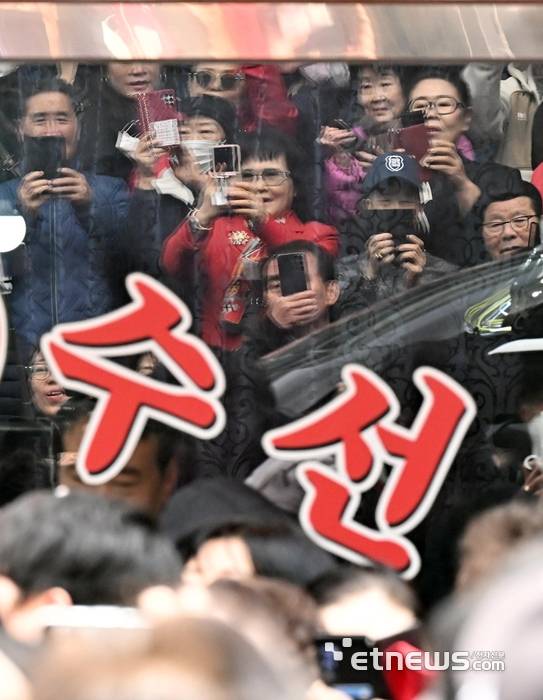 서울 한 시장을 방문한 유명 정치인을 보려는 유권자의 모습이 건물 유리창에 비칩니다. 환호하는 유권자들의 표정에 새로운 국회에 대한 기대감이 묻어납니다. 4월 10일 새롭게 선출될 300명의 22대 국회의원은 더 이상 정쟁이 아닌 민생을 잘 살피길 바라봅니다.