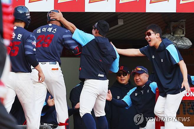 (인천=연합뉴스) 임순석 기자 = 24일 오후 인천 SSG랜더스필드에서 열린 2024 신한 쏠뱅크 KBO리그 롯데 자이언츠와 SSG 랜더스의 경기. 9회 초 2사 2루 롯데 레이예스가 동점 2점 홈런을 친 뒤 동료의 환영을 받고 있다. 2024.3.24