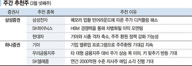 24일 삼성증권은 2월 이후 강도가 높아진 외국인들의 대규모 순매수에 주목하며 "주력 품목인 반도체 수출이 회복되고 있고, 한국시장의 상대 가격 매력과 정책 모멘텀이 부각되고 있다"고 전했다. 실제 반도체 수출은 지난 2월까지 4개월 연속 증가하고 있고, 정부가 '기업 밸류업 프로그램'을 추진하면서 기업들의 자발적인 주주가치 증대 움직임도 빨라졌다. 삼성증권은 "AI 반도체와 밸류업 관련 업종 중심으로 포트폴리오를 유지하되, 장기 낙폭이 큰 업종 순환매를 고려한 전술적 대응도 좋은 선택"이라고 권했다. 삼성전자, SK하이닉스, 현대차, 삼성SDI, 삼성물산, 현대모비스, 한화오션, 유한항행, CJ, 가온칩스 등이 추천종목이다. 현대차는 일찌감치 주주환원정책을 실시한 기아의 주가와 디커플링 되고 있는 점을 이유로 들었다.