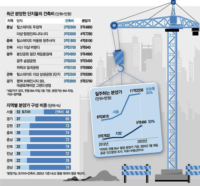 지난 2년간 부동산 침체로 집값이 떨어졌는데도 분양가가 계속 오르는 이유는 불어난 공사비 때문이다. 이전만 해도 분양가격을 상승시키던 주요 원인은 땅값이었다. 그때문에 지방보다는 서울·수도권 분양가 상승세가 강했고, 문재인 정부는 분양가 상한제 등을 활용해 이를 억누르려고 했다.