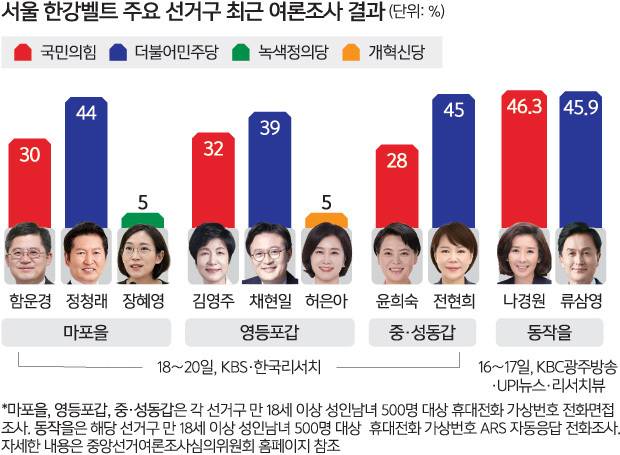 한강벨트 내 선거구인 서울 마포을과 중·성동갑 같은 경우 각각 3건의 여론조사 모두 오차범위 밖에서 민주당 후보가 앞선 모습이었다.