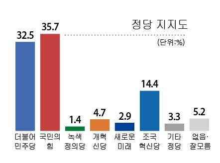 이어 녹색정의당은 1.7%, 개혁신당은 4.5%, 새로운미래는 3.7%를 기록했고 기타 정당 3.3%, 지지 정당 없음 5.8%, 잘 모름 1.3%로 집계됐다.