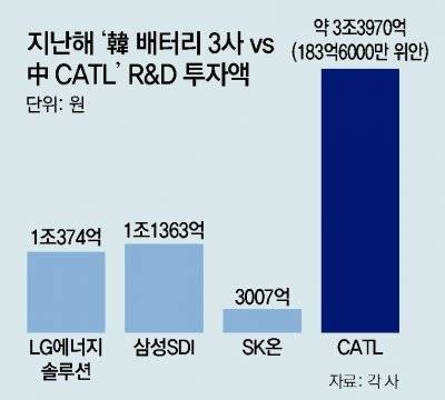 다만 일각에서는 공장 증설에만 집중해 연구개발(R&D) 투자에 상대적으로 소홀해지는 것 아니냐는 우려도 제기된다. 국내 3사 모두 매출액 대비 R&D 비중은 줄어드는 추세다. LG에너지솔루션은 2022년 3.4%에서 지난해 3.1%, 삼성SDI는 5.4%에서 5.0%, SK온은 3.1%에서 2.3%로 감소했다. R&D 절대액 자체는 모두 전년 대비 늘었지만 3사를 합친 규모가 2조4744억 원으로 중국 CATL(183억6000만 위안·약 3조3970억 원) 한 곳에 못 미친다.