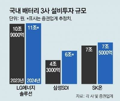 24일 배터리 업계 및 증권가에 따르면 3사의 올해 시설투자액(CAPEX)은 모두 합쳐 24조5000억 원에 이를 것으로 추정된다.