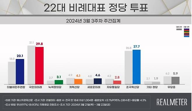여론조사 전문기관 리얼미터가 에너지경제신문 의뢰로 지난 21~22일 이틀간 전국 18세 이상 유권자 1004명을 대상으로 비례대표 정당 투표 의향을 물은 결과, 국민의힘 비례정당인 국민의미래를 찍겠다는 응답이 29.8%로 가장 높게 집계됐다.