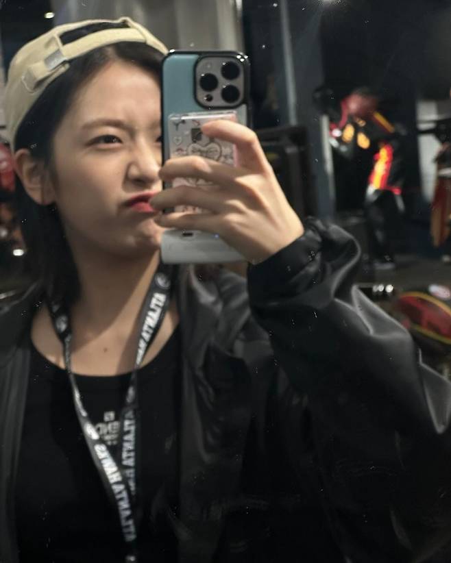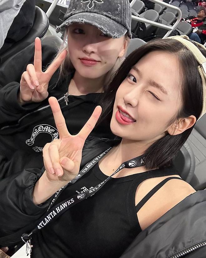 사진에는 안유진이 같은 그룹의 멤버 리즈와 함께 미국 프로농구(NBA) 애틀랜타 호크스의 경기를 보러 간 모습이 담겼다.