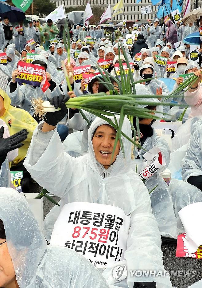 대파 들고 시위 참가한 농민들