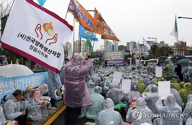 (세종=연합뉴스) 배재만 기자 = '국민과 함께하는 농민의길' 주최로 25일 오후 정부세종청사 기획재정부 앞에서 열린 수입농산물 철폐 전국농민대표자대회에서 참가자들이 구호를 외치고 있다. 2024.3.25