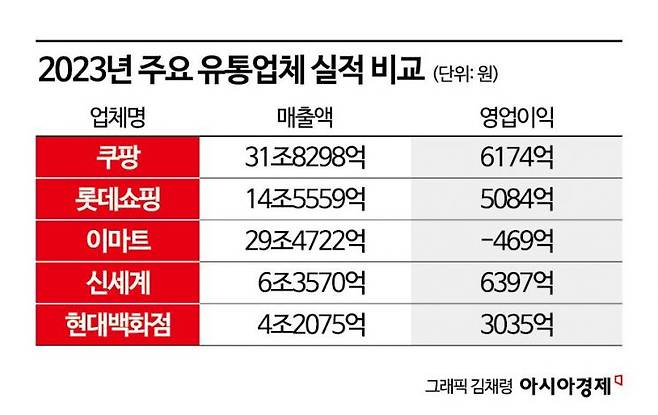 2022년 국내 e커머스 시장에서 1위 자리에 올랐던 쿠팡은 지난해 온·오프라인을 합친 전체 유통시장에서 가장 많은 매출을 올렸다. 쿠팡은 자체 물류망 등에 대한 지속적인 투자로 몸집을 불려왔다. 쿠팡의 지난해 매출(약 31조8298억원)은 이마트와 신세계백화점 매출을 합친 규모(35조8292억원)와 맞먹는다. 쿠팡은 지난해 4억7300만달러(약 6174억원)의 영업이익을 기록하면서 창립 후 처음으로 연간 흑자를 내는 데도 성공했다. 쿠팡의 지난해 영업이익 규모는 국내 유통기업 중 신세계(6397억원) 다음으로 많다.