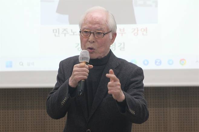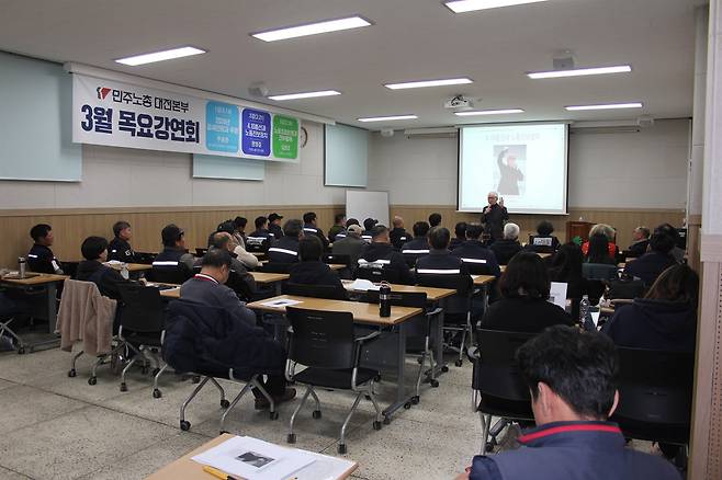 지난 3월 21일 오후 6시 30분, 민주노총 대전지역본부(본부장 김율현)는 권영길 지도위원(민주노총/전 국회의원)을 초청해 '4·10 총선과 노동진보정치'란 주제로 강연회를 열었다. 권영길의 이날 강연은 1월 30일 전국민주일반노조 강연. 2월 20일 민주노총 경남본부 강연에 이어 2024년에 열리는 세 번째 강연이다.