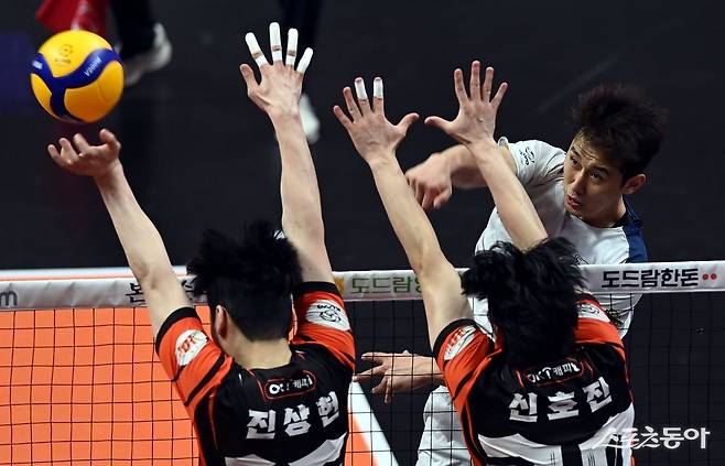 25일 경기도 안산 상록수체육관에서 ‘2023-2024 도드람 V리그’ 안산 OK금융그룹과 서울 우리카드의 남자부 플레이오프 경기가 열렸다. 우리카드 한성정이 OK금웅그룹 블로커를 피해 스파이크를 날리고 있다.