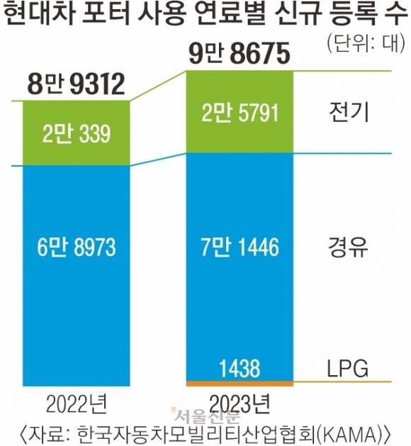 25일 한국자동차모빌리티산업협회(KAMA)에 따르면 지난해 전기차 모델인 포터 일렉트릭의 판매량은 전년 대비 26.8% 증가한 2만 5791대를 기록했다. 같은 기간 포터 경유차의 판매량이 3.6% 늘어나는 데 그친 것과 대조적이다. 전체 포터 판매량 중에서 전기차 모델이 차지하는 비중도 전년 22.8%에서 지난해 26.1%로 3.3% 포인트 늘었다.