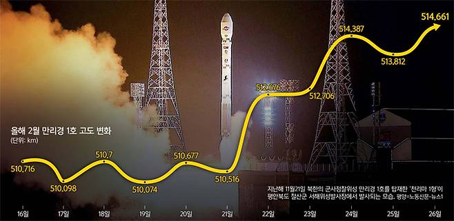 북한 정찰위성 ‘만리경 1호’가 최근 자체 추력기를 통해 고도를 끌어올린 것으로 분석됐다. 인공위성 궤도 조절 기능이 있으며 지상과 교신을 하고 있다는 사실이 확인됐다. 군 당국은 만리경 1호가 정찰위성의 기능을 하지 못한다고 보고 있다. 그러나 이런 궤도 조정 기술 확보만으로도 충분히 위협적이라는 시각이 많다. 현재로서는 가능성이 희박하지만, 기술이 진전된다면 우주 공간을 활용한 핵 공격도 그려 볼 수 있어서다.