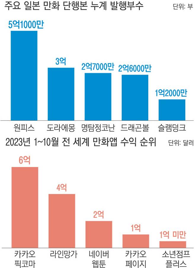 새로운 시장에서 치고 올라온 것은 한국계 업체들이었다. 라인·카카오저팬·NHN저팬 등은 독자들이 읽기 편한 방식과 무료 읽기 등을 도입하는 등 공세적인 전략으로 디지털 유통 시장을 선점했다. 모바일 데이터 분석 기업인 ‘센서타워’의 분석 자료에 따르면 지난해 세계 만화 애플리케이션(앱) 매출 1위는 카카오의 일본 자회사인 ‘카카오픽코마’였다. 이어 네이버 자회사 ‘라인망가’, ‘네이버웹툰’, ‘카카오페이지’ 순이었다. 일본의 만화 앱 시장도 한국이 장악했다. 카카오픽코마는 2020년 7월부터 줄곧 일본 내 디지털 만화 플랫폼 점유율 1위 자리를 지키고 있다.
