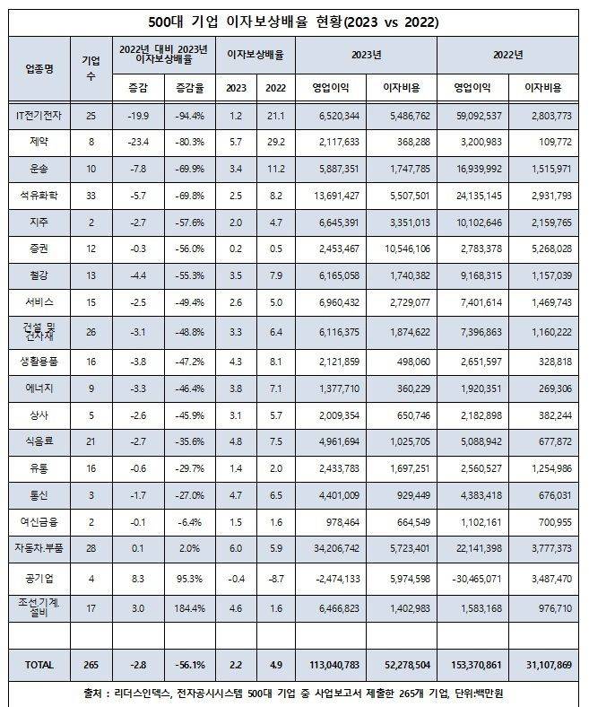 한편 이번 조사는 리더스인덱스가 매출기준 상위 500대 기업 중 사업보고서를 제출하고 최근 3년 비교가능한 대기업의 매출액, 영업이익, 이자비용을 분석한 결과다. 은행, 보험 및 금융지주는 제외했으며 증권, 카드사의 실적 및 이자비용은 분석에 포함했다.