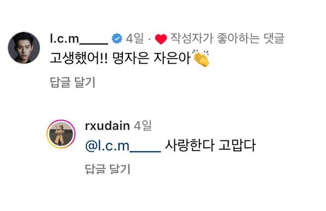 이채민은 지난 21일 tvN '피라미드 게임'에서 명자은 역을 맡았던 류다인에게 "고생했다! 명자은! 자은아"라는 멘트와 함께 박수 이모티콘을 남겼다. 이에 류다인은 "사랑한다. 고맙다"라고 화답해 눈길을 끌었다.