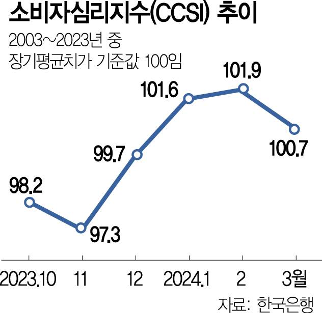26일 한국은행에 따르면 3월 소비자심리지수(CCSI)는 100.7로 전월보다 1.2포인트 하락했다.
