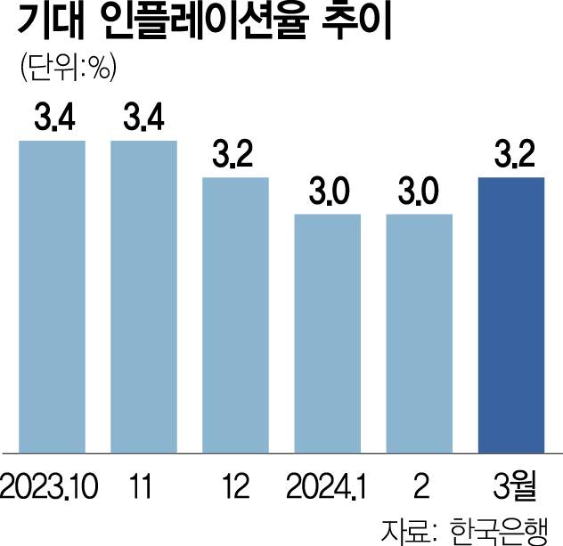 소비심리의 위축 우려는 커졌지만 물가는 여전히 잡히지 않고 있다. 한국은행에 따르면 2월 생산자물가지수는 1월(121.83)보다 0.3% 높은 122.21(2015년 수준 100)로 집계됐다. 감귤(31.9%), 배추(26.3%), 우럭(57.9%) 등 농수산물의 상승세가 두드러졌다. 특히 3월 인플레이션 기대가 꿈틀대면서 정부와 한은의 물가 대응에 빨간불이 들어왔다. 기준금리 조정의 핵심 고려 요인인 기대 인플레이션이 흔들리면서 물가를 책임지는 한은의 책임론도 커지고 있다.