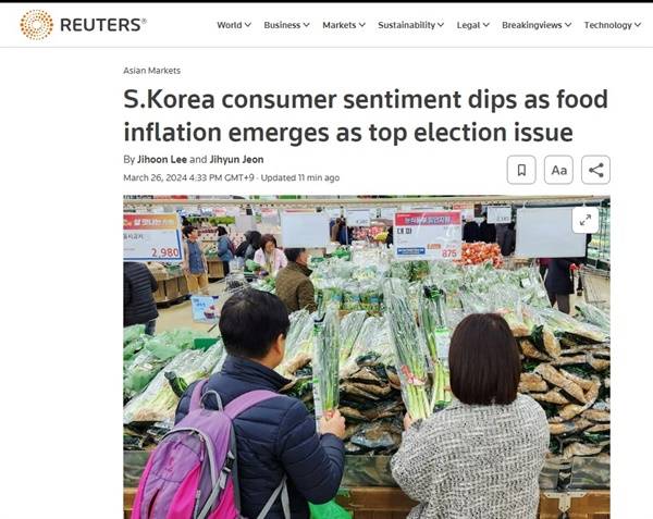 26일(현지시각) 로이터통신은 "먹거리 물가 상승이 총선 최대 이슈로 떠오르면서 한국 소비자심리지수 위축"이라는 제목의 기사를 보도했다.