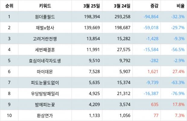 트렌드 지수 1위 원더풀 월드의 빅데이터 조사한 결과, 원더풀 월드 인물관계도, 원더풀 월드 드라마, 원더풀 월드 원작, 원더풀 월드 몇부작, 원더풀 월드 김남주 등이 주목받는 관련 검색어로 나타났으며 2위 재벌x형사는 재벌x형사 재방송, 재벌x형사 몇부작, 재벌x형사 ott, 재벌x형사 넷플릭스, 재벌x형사 시청률, 3위 고려 거란 전쟁은 고려 거란 전쟁 몇부작, 고려 거란 전쟁 결방, 고려 거란 전쟁 등장인물, 고려 거란 전쟁 시청률, 고려 거란 전쟁 넷플릭스 등으로 나타났다.