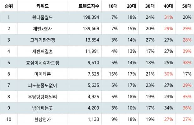 연령별 선호도에서는 원더풀 월드가 10대 7%, 20대 18%, 30대 24%, 40대 31%, 50대 20%로 나타났다.