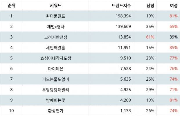 성별 선호도 분석 결과 1위 원더풀 월드는 남성 19%, 여성 81%, 2위 재벌x형사는 남성 35%, 여성 65%, 3위 고려 거란 전쟁은 남성 61%, 여성 39%가 선호하는 것으로 나타났다.