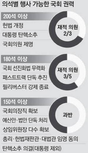결론적으로 어느 당이든 180석 이상을 얻으면 개헌·대통령 탄핵·국회의원 제명을 제외한 모든 국회 권력을 휘두를 수 있게되는 셈이다.