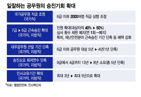 국가·지방공무원의 근속 승진 체계도 개편키로 했다. 기존 7급에서 6급으로의 근속승진의 경우 직렬별로 11년 이상 7급 재직자의 40% 규모에서 연 1회만 실시했지만 앞으로는 이를 50%로 확대하고 승진심사 횟수 제한을 폐지키로 했다. 특히 재난·안전 분야에 2년 이상 계속 근무한 공무원은 누구나 승진임용 후보자가 될 수 있도록 규정을 손질하고, 근속 승진 기간도 1년을 단축해 심사요건을 완화키로 했다. 이외에도 6급 이하 실무직 공무원에 대한 대우공무원 선발기간을 현행 5년에서 4년으로 1년 단축해 장기근무자의 처우를 개선키로 했다.