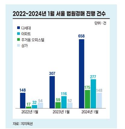 경매 전문 플랫폼 지지옥션에 따르면 법원 경매 진행건수는 증가하고 있다. 전세사기 여파에 시달리던 다세대와 주거용 오피스텔은 물론 아파트와 공장, 상가 경매도 늘었다. 경매 진행건수에는 지난번 유찰돼 감정가보다 낮은 가격에 최저입찰가가 나오는 경매 건도 포함된다.
