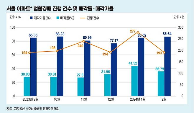 그럼에도 주춤하던 서울 아파트 경매 낙찰률과 낙찰가율은 올해 들어 회복되고 있다. 지난해 4분기 30% 전후에 머물던 서울 아파트 낙찰률은 올해 1월 41.52%로 지난해 7월 이후 처음으로 40%를 웃돌았다.