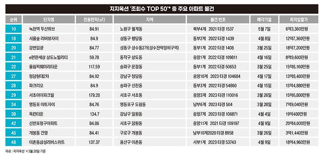 3월 20일 지지옥션 ‘조회수 TOP 50’(누적 기준) 물건에는 입지가 좋은 준강남급 신축 또는 신축에 가까운 2000년대 입주 아파트가 다수 포함됐다. 성동구 행당동 ‘서울숲 리버뷰자이’(2018년 사용승인, 동부2계 2022 타경 1439), 동작구 상도동 ‘e편한세상 상도노빌리티’(2018년 사용승인, 중앙1계 2022 타경 109811), 송파구 신천동 ‘파크리오’(2008년 사용승인, 동부3계 2022 타경 54860) 등이다.