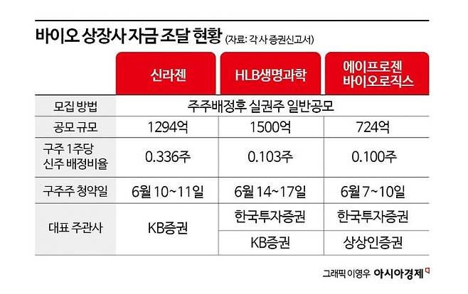 HLB생명과학도 주주배정후 실권주 일반공모 방식으로 신주를 발행한다. 구주 1주당 신주 0.103주를 배정해 1500억원을 조달할 것으로 예상했다. 신주 발행 예정가는 1만3630원으로 현재 주가 2만3800원 대비 40%가량 저렴하다. 대표 주관사는 한국투자증권과 KB증권이다. 일반 공모가 끝난 후에도 잔여주가 발생하면 주관사가 인수한다. 인수 수수료는 16.0%로 책정했다.
