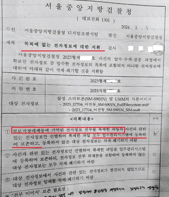 | ▲ 이진동 <뉴스버스> 대표가 촬영한 서울중앙지방검찰청의 <목록에 없는 전자정보에 대한 지휘> 공문. |
